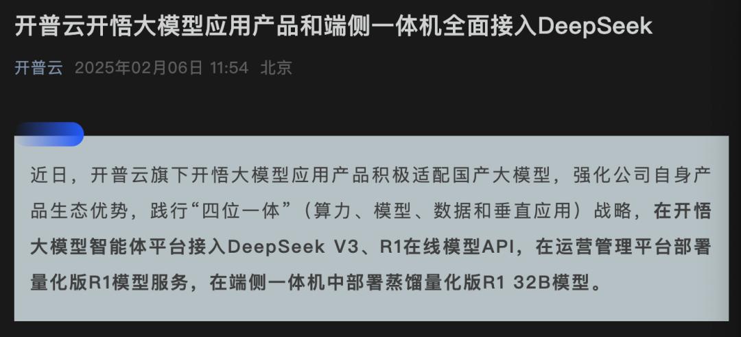 開普云則宣布在開悟大模型智能體平臺接入DeepSeek V3、R1在線模型API,在運營管理平臺部署量化版R1模型服務(wù),在端側(cè)一體機中部署蒸餾量化版R1 32B模型。