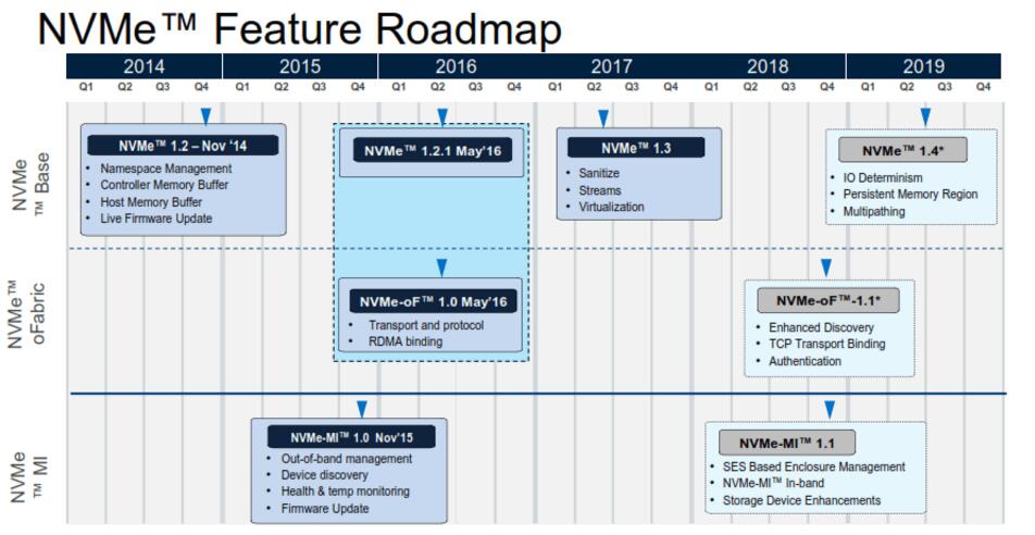 第一個NVMe規(guī)范逐漸增加了更新的功能——1.2版本中的實時固件更新和1.3版本中的清理功能已經(jīng)在SCSI和SATA中很常見了。明年年中推出NVMe 1.4版本將增加IO Determinism功能,以確?缇W(wǎng)絡和存儲的緊密且一致的延遲。同時,新增的管理規(guī)范也提供了管理設備機箱的能力。